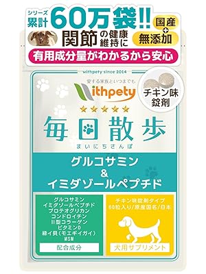 そんな願いを持つ飼い主さんにぴったりなのが、今回ご紹介している 「毎日散歩 グルコサミン&イミダゾールペプチド」 です。
