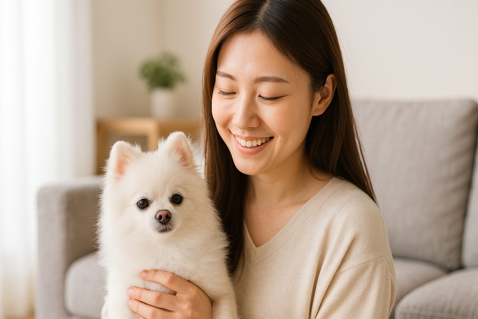 白ポメラニアンを優しく抱く清潔感のある日本人女性、自然光のリビングで微笑む様子