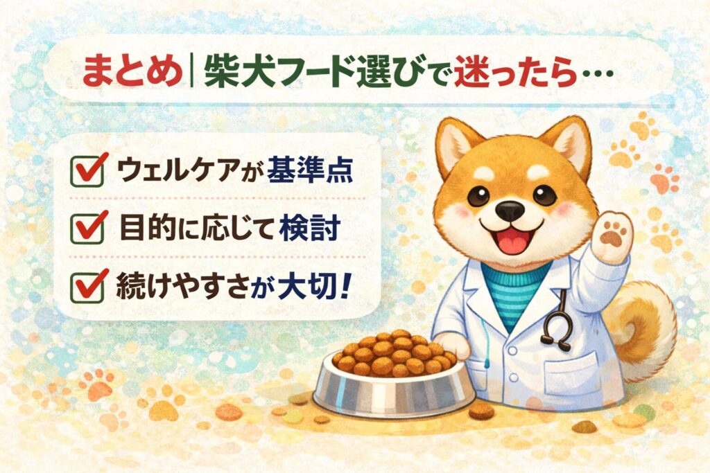 このように、3つのブランドは「良い・悪い」で比較するものではなく、重視したいポイントによって向いている人が違うという関係にあります。柴犬向けとして迷った場合は、まずウェルケアを基準に考え、健康管理を重視するならヒルズ、価格や入手性を優先するならユニ・チャームといった形で選ぶと判断しやすくなります。